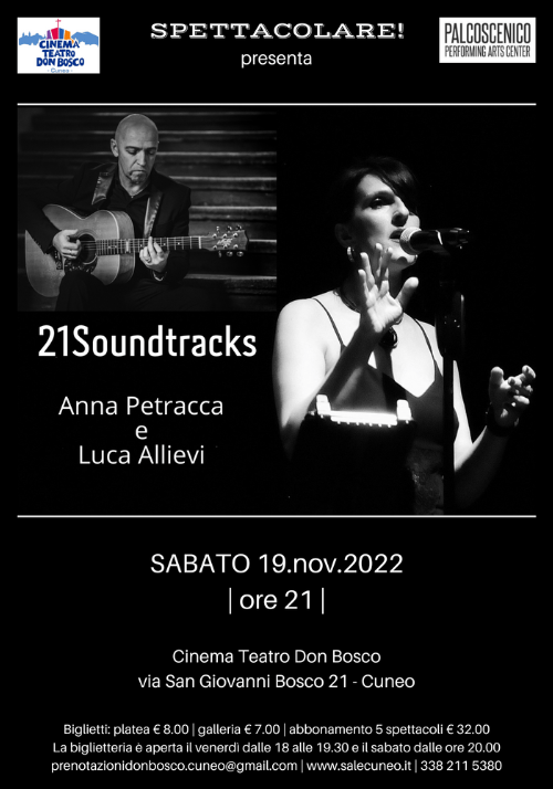 Il quarto appuntamento del cartellone SPETTACOLARE! propone, in collaborazione con Palcoscenico Performing Arts Center, lo spettacolo musicale 21soundtracks con la voce di Anna Petracca e la chitarra di Luca Allevi, sabato 19 novembre, alle ore 21.