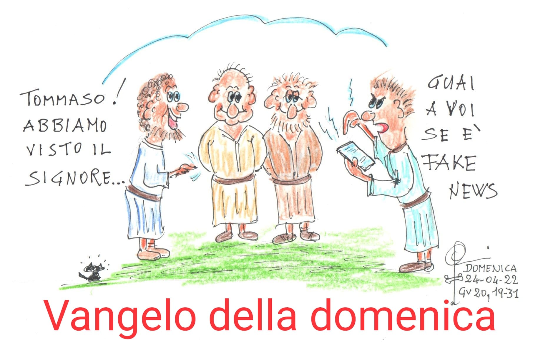 26Otto giorni dopo i discepoli erano di nuovo in casa e c’era con loro anche Tommaso. Venne Gesù, a porte chiuse, stette in mezzo e disse: «Pace a voi!». 27Poi disse a Tommaso: «Metti qui il tuo dito e guarda le mie mani; tendi la tua mano e mettila nel mio fianco; e non essere incredulo, ma credente!». 28Gli rispose Tommaso: «Mio Signore e mio Dio!». 29Gesù gli disse: «Perché mi hai veduto, tu hai creduto; beati quelli che non hanno visto e hanno creduto!».